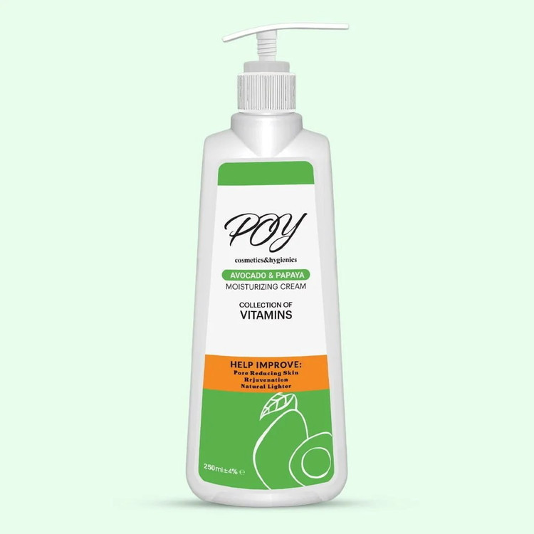 میوه آوکادو سرشار از ویتامین A است. آوکادو پوست را در مقابل سوختگی و جوش محافظت میکند و آثار بجای مانده از زخم و آکنه را از بین میبرد. مواد مغذی موجود در کرم مرطوب کننده حاوی آوکادو و پاپایا P.O.Y مانند یک ماسک محافظ از پیری و لایه لایه شدن پوست جلوگیری میکند. این کرم با ترمیم و احیا پوست، موجب میشود پوستی شفاف و روشن داشته باشید.