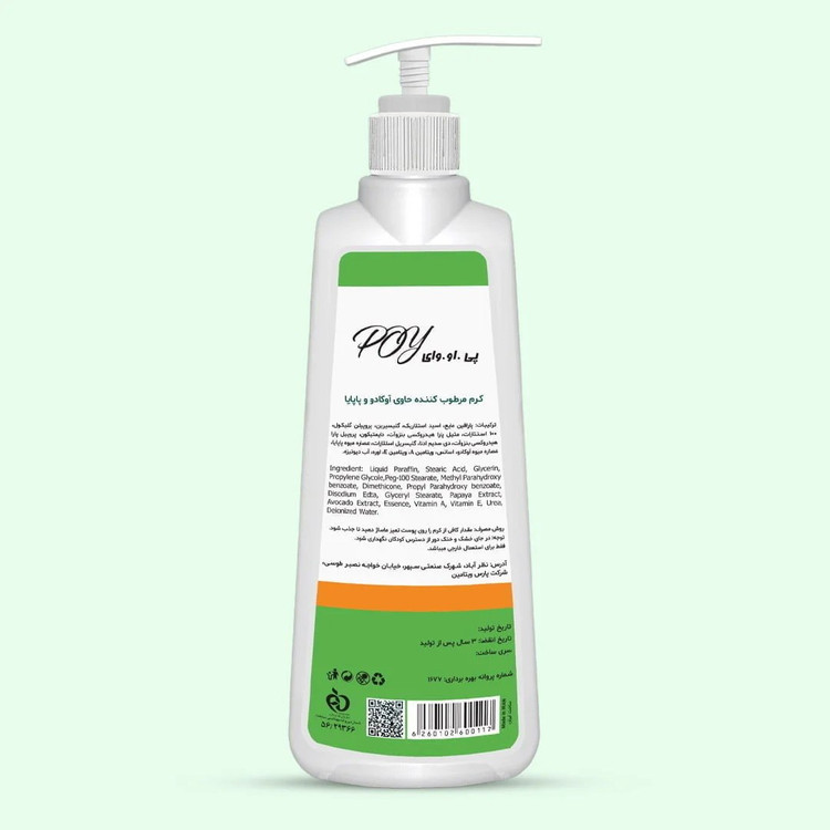 کرم مرطوب کننده حاوی عصاره آوکادو و پاپایا P.O.Y یک آبرسان قوی و تنظیم کننده چربی پوست است.